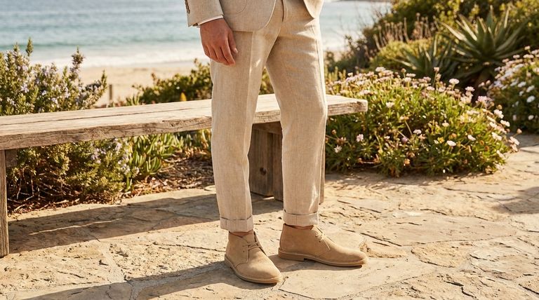 然而,面料与颜色同等重要。选择结构挺括但透气的材质,如亚麻、棉或泡泡纱,颜色可选卡其色、浅灰色或柔和的蓝色。沙漠靴(通常是绒面革)的质感与这些夏季面料的哑光效果完美互补。