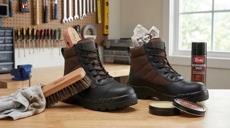 延长工装靴寿命并非依赖单一产品,而是遵循有规律的保养周期。这个系统可以防止材料因其三大敌人——污垢、湿气和热量——而损坏,确保您的靴子更长时间地保持安全、支撑和耐用。