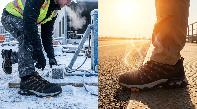 复合材料鞋头靴在各种气候下表现出色的主要原因是其材料的绝缘性。与金属不同,金属会迅速传导温度,而复合材料则在您的脚和外部环境之间形成一个缓冲层。
