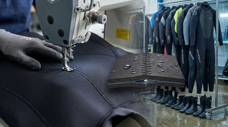 在进行任何缝合之前,氯丁橡胶面板的边缘会被精确切割并用特殊的强力粘合剂粘合在一起。这种胶水为接缝提供了主要的防水屏障。