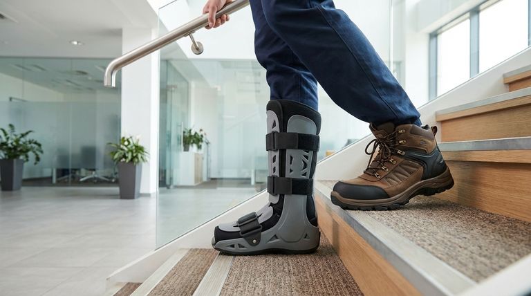 使用助行靴安全上下楼梯,上楼时始终先迈出未受伤的脚,下楼时先迈出受伤的脚。这个简单的规则,通常被记住为“上身好腿,下身坏腿”,可以确保您强壮的腿承担主要的负重并控制您的动量,从而最大限度地减少对受伤部位的压力。始终使用扶手以保持稳定,并缓慢而谨慎地移动。